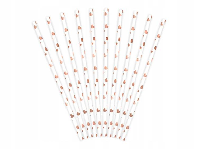 Słomki papierowe w kolorze białym z metalizowanymi sercami w kolorze jasnego różowego złota.