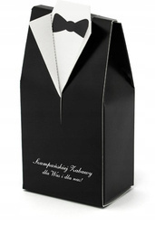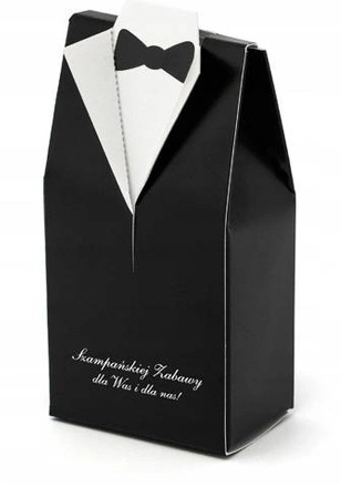 Pudełeczka Pan Młody wykonane z papieru w kolorze czarno-białym z napisem: "Szampańskiej Zabawy dla Was i dla nas"