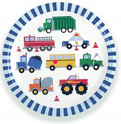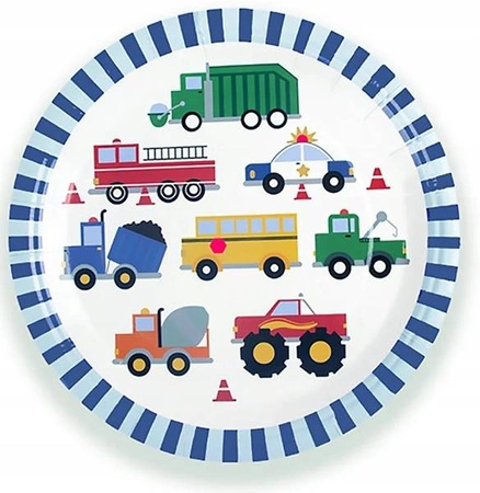 Talerzyki papierowe kolorowe w motywem pojazdów.